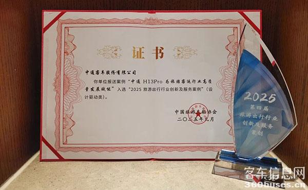 會上,“2025旅游出行行業(yè)創(chuàng)新及服務(wù)精品案例”結(jié)果正式發(fā)布,“中通H13Pro為旅游客運(yùn)行業(yè)高質(zhì)量發(fā)展賦能”作為助力行業(yè)高品質(zhì)發(fā)展的典型案例,成功入選。