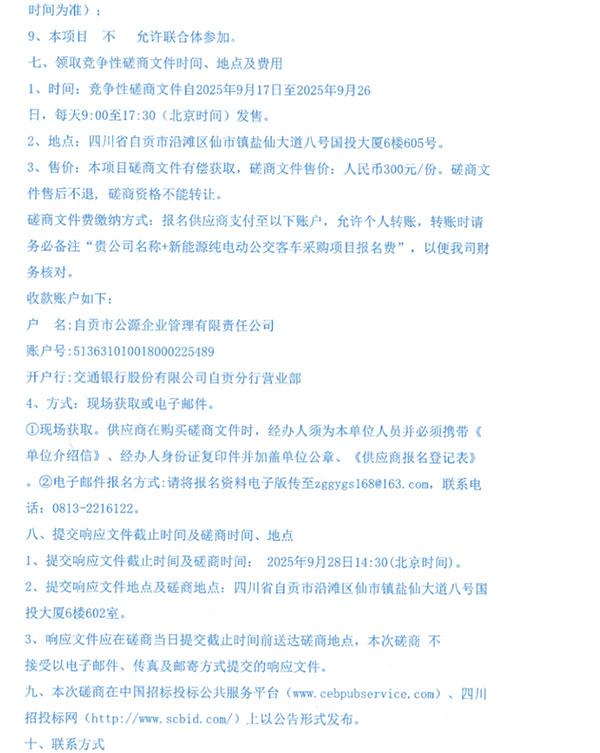 近日,四川省自貢市公交集團有限責任公司發(fā)布新能源純電動公交客車采購項目(招標編號:GYGL-SCZC-2025004)的延期公告(補遺02號),明確將競爭性磋商文件發(fā)售時間從2025年9月17日09:00至9月26日17:30延期至2025年9月30日18:00,磋商保證金繳納截止時間同步順延至2025年9月30日18:00,提交響應(yīng)文件截止時間及磋商時間由2025年9月28日14:30調(diào)整為2025年10月9日14:30,其余內(nèi)容保持不變,旨在為潛在投標人預(yù)留更充足準備周期,保障招標工作有序推進。