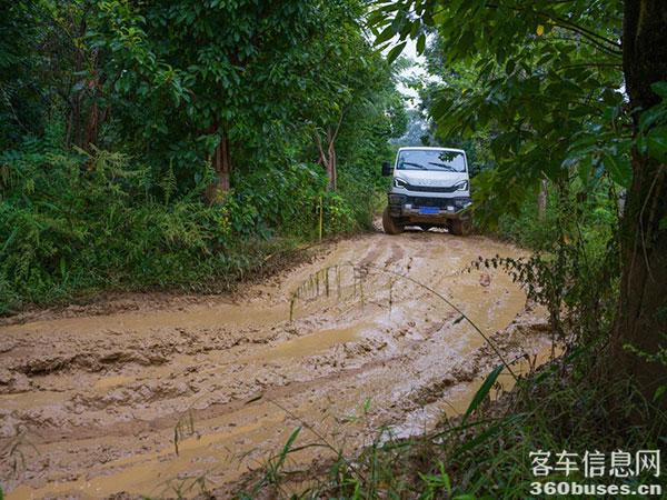 從雞窩坑脫困而出,經(jīng)過(guò)一段小樹林,就來(lái)到第二個(gè)關(guān)卡——交叉軸路段。對(duì)擁有全時(shí)四驅(qū)+三把鎖的依維柯歐霸·山海來(lái)說(shuō),想要通過(guò)這一關(guān),其實(shí)并不困難,只需在低速四驅(qū)模式下鎖止中央差速鎖,萬(wàn)一遇到單側(cè)后輪打滑的情況也沒(méi)關(guān)系,只要啟用后橋差速鎖,讓兩個(gè)后輪同步轉(zhuǎn)動(dòng),獲得相同扭矩,?一樣可以輕松脫困。
