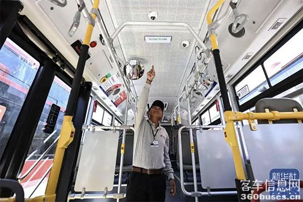 ↑10月16日,在智利科皮亞波,一名司機(jī)介紹新啟用的中國(guó)生產(chǎn)的新能源公交車(chē)。