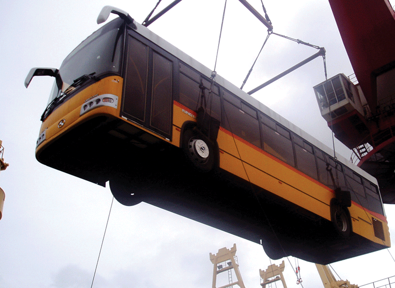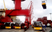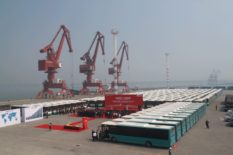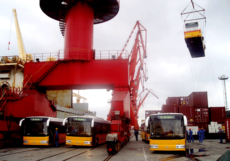 82輛大金龍11米低地板公交客車由上海裝船出口馬耳他,中國客車首次進入歐洲市場。