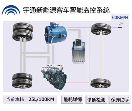 新能源智能觸摸屏;宇通新能源客車智能監(jiān)控系統(tǒng)可以實(shí)時(shí)地顯示車輛當(dāng)前百公里油耗、故障信息提示以及保養(yǎng)信息的提示。
