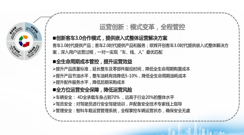 發(fā)布會上,福田汽車集團(tuán)副總裁、歐輝客車事業(yè)部總經(jīng)理解佃峰先生介紹:“人品+產(chǎn)品”,是福田歐輝當(dāng)下和未來業(yè)務(wù)的發(fā)展之路,正是有這種“責(zé)任、誠信、感恩、追求進(jìn)步”的“歐輝人精神”,才能制造出“可靠、安全、節(jié)能、技術(shù)領(lǐng)先”的客車產(chǎn)品,才能從科技、品質(zhì)、運(yùn)營管理和服務(wù)四個方面全方位、全范圍保障客車用戶企業(yè)的價值升級。