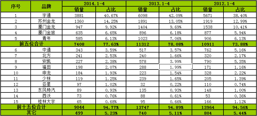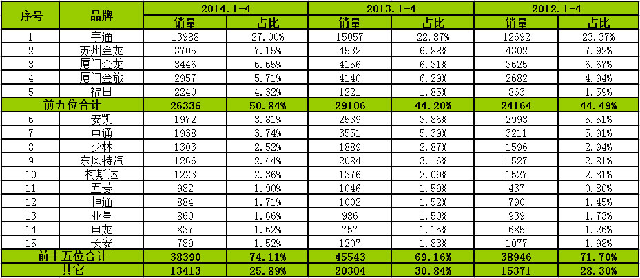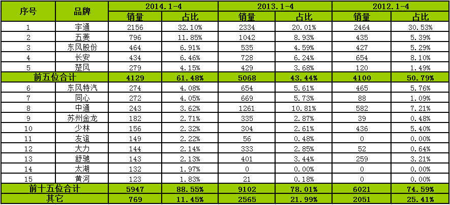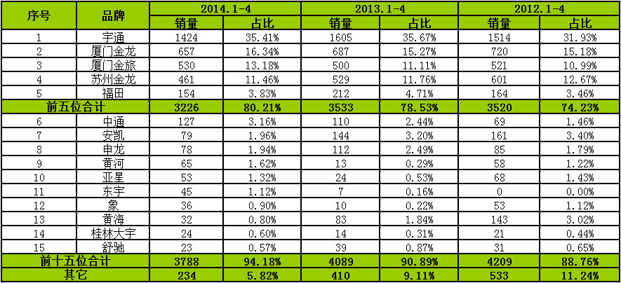 從品牌銷量來看,宇通、三龍和福田排名前5位,合計(jì)銷量3226輛,占比80.21%,處于市場(chǎng)決定壟斷地位,2013和2012年同期達(dá)到78.53%和74.23%,說明團(tuán)體市場(chǎng)品牌認(rèn)知度較高。2014年1-4月份,前十五家企業(yè)合計(jì)銷售3788輛,占比94.18%,2013和2012年同期達(dá)到90.89%和88.76%。