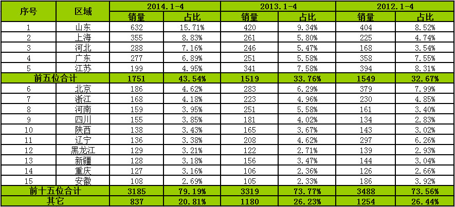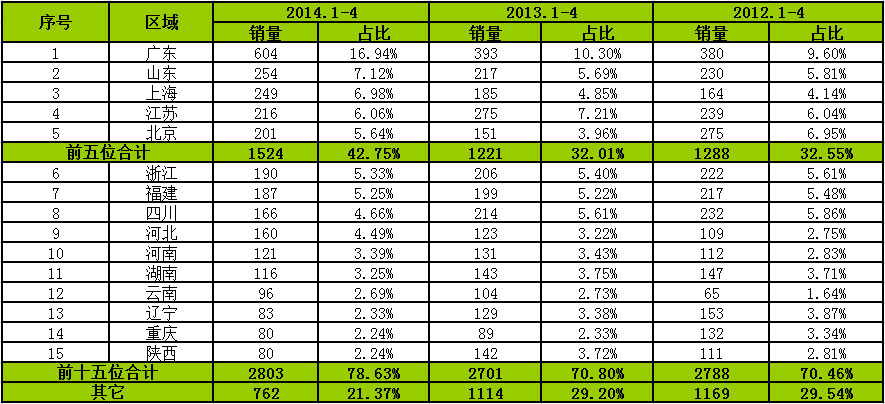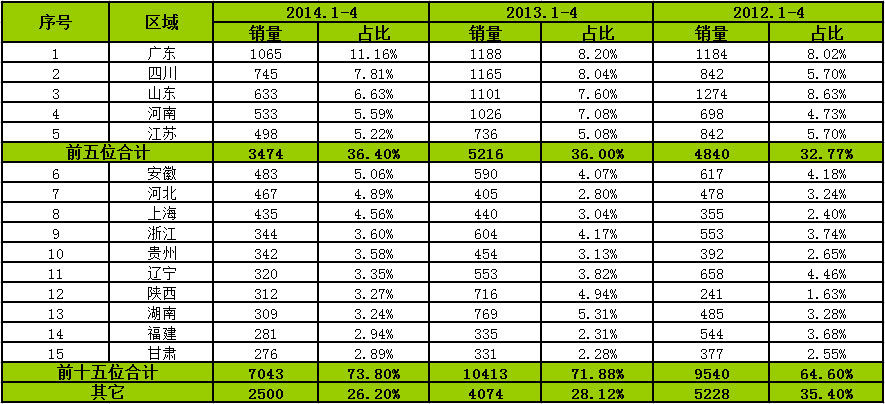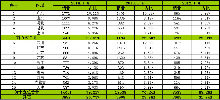 按照客車市場(chǎng)區(qū)域流向來看,2014年前4個(gè)月前十五個(gè)區(qū)域合計(jì)銷售38820輛,占比74.94%。其中,廣東、山東、湖南、河南和河北排名前5位,合計(jì)銷售19137輛,占比36.94%,江蘇、四川等10個(gè)區(qū)域占比前十五個(gè)區(qū)域的一半,其他區(qū)域占比25%。