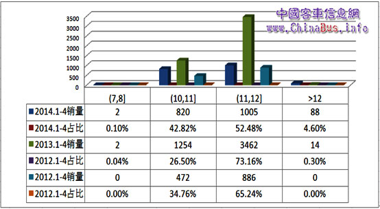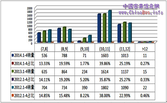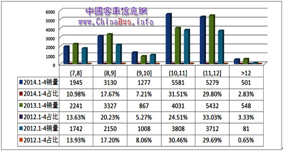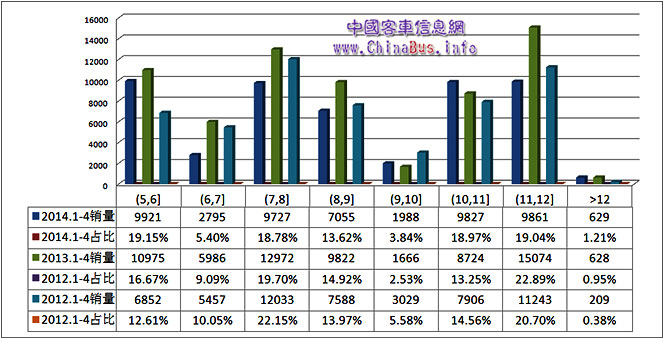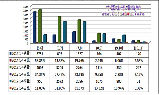 中國(guó)客車信息網(wǎng)按照客車區(qū)間段銷量統(tǒng)計(jì)顯示,前四個(gè)月5-6m、7-8m、10-11m和11-12m銷量均在近萬輛左右,占比均在19%左右,其中5-6m和10-11m市場(chǎng)份額逐年增長(zhǎng),而7-8m和11-12m市場(chǎng)份額相對(duì)穩(wěn)定。6-7m市場(chǎng)份額下滑較為明顯,前4個(gè)月銷售近2800輛,而9-10m和12m以上基數(shù)較小,市場(chǎng)波動(dòng)也較大。