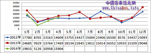 2014年前四個(gè)月,國(guó)內(nèi)客車整體市場(chǎng)低迷,高鐵競(jìng)爭(zhēng),校車熱點(diǎn)的消失,新能源政策的調(diào)整對(duì)市場(chǎng)影響較大。2014年前四個(gè)月國(guó)內(nèi)整體上牌量達(dá)到5萬多輛,同比2013年下滑幅度較為明顯,同比2012年略有下滑。受國(guó)家排放新標(biāo)準(zhǔn)的實(shí)施,2014年四季度將是采購(gòu)高峰期。