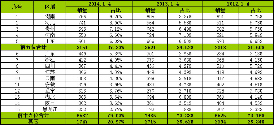 從區(qū)域市場(chǎng)流向來看,2014年1-4月份湖南、河北、貴州、河南和山東排名前五位,市場(chǎng)集中度達(dá)到近40%,近3年逐漸遞增。前十五位區(qū)域市場(chǎng)占行業(yè)比重在70%-80%,說明農(nóng)村客運(yùn)市場(chǎng)主要集中在前十五個(gè)區(qū)域市場(chǎng)。綜合近3年市場(chǎng)來看,農(nóng)村客運(yùn)市場(chǎng)主要集中在人口大省和經(jīng)濟(jì)相對(duì)處于發(fā)展中的省份,如湖南、湖北、河南、河北、貴州、山東、四川和安徽等地。
