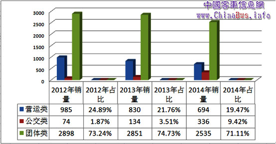 根據(jù)國(guó)內(nèi)上牌情況,中國(guó)客車信息網(wǎng)對(duì)2014年前四個(gè)月國(guó)內(nèi)客車銷售情況進(jìn)行了數(shù)據(jù)統(tǒng)計(jì),數(shù)據(jù)顯示,前四個(gè)月,客車整體上牌數(shù)51803輛,同比2013年下滑21.3%,同比2012年下滑4.6%。其中團(tuán)體、農(nóng)村客運(yùn)和考斯特相對(duì)穩(wěn)定,市場(chǎng)占有率分別保持在7%、16%和6%左右;受高鐵的影響,營(yíng)運(yùn)車市場(chǎng)下滑較為明顯,同比2013年下滑3.58%,同比2012年下滑8.77%;受校車熱點(diǎn)、校車運(yùn)營(yíng)管理、資金來源等的影響,校車市場(chǎng)波動(dòng)較大;受國(guó)家政策變動(dòng)的影響,新能源車市場(chǎng)波動(dòng)也較大;受國(guó)家政策、城市發(fā)展需求、農(nóng)村一體化改造等的影響,公交車市場(chǎng)始終保持著增長(zhǎng)態(tài)勢(shì)。