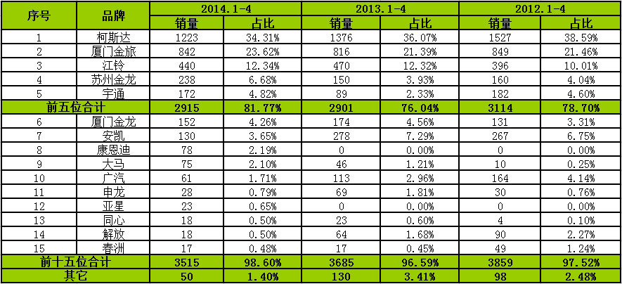 從品牌銷量來看,柯斯達(dá)、廈門金旅、江鈴、蘇州金龍和宇通排名前5位,2014年前4個(gè)月合計(jì)銷售2915輛,占比82%,2013和2012年同期達(dá)到76%和79%。廈門金龍、安凱等品牌排名第6-15位,前十五企業(yè)近3年占比均達(dá)到95%以上,充分說明市場(chǎng)競(jìng)爭(zhēng)來源前15家企業(yè),特別是前5家企業(yè)的影響。受自主品牌拉動(dòng)以及國(guó)家公務(wù)用車政策的影響,導(dǎo)致豐田柯斯達(dá)品牌近3年市場(chǎng)份額逐年下降。