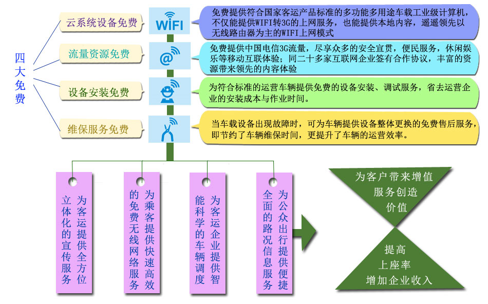 據(jù)統(tǒng)計(jì),國內(nèi)客車的年客流量400億人次,若按14億人計(jì),人均每年乘坐客車達(dá)28次。伴隨這一巨大人流量的是無數(shù)手機(jī)、PAD等移動(dòng)終端的應(yīng)用,5月14日,海格“云戰(zhàn)略”的發(fā)布,海格云的問世解決了移動(dòng)終端用戶瀏覽網(wǎng)絡(luò),面臨的網(wǎng)速、費(fèi)用、存儲(chǔ)空間等問題。海格云戰(zhàn)略實(shí)行的4大免費(fèi),將免費(fèi)的移動(dòng)互聯(lián)網(wǎng)導(dǎo)入車廂,使客車產(chǎn)品和客運(yùn)業(yè)真正實(shí)現(xiàn)轉(zhuǎn)型升級。