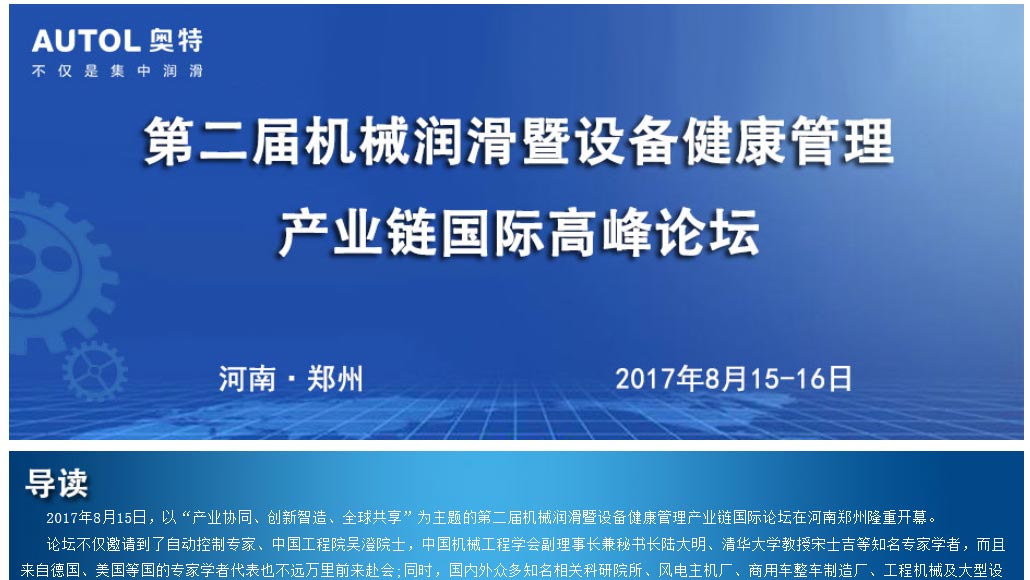 2017年8月15日,以“產(chǎn)業(yè)協(xié)同、創(chuàng)新智造、全球共享”為主題的第二屆機(jī)械潤滑暨設(shè)備健康管理產(chǎn)業(yè)鏈國際論壇在河南鄭州隆重開幕。 ... 更多>>